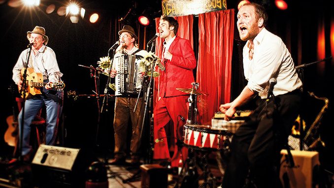 Ralf Wieland, genialer Geschichtenerzähler und Gitarrist, führt durch das Programm. Außerdem mit von der Partie: der elegante Arztsohn Dr. Simon Schorndanner Junior an Saxophon und Klarinette, der launische Akkordeonmeister Maximilian Eder sowie der lausbübische Percussion-Tausendsassa Johannes Sens.