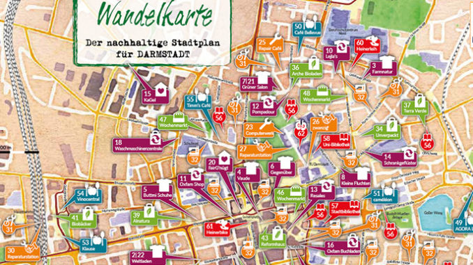 Das dachten sich die Macher der Wandelkarte. Sie entwickelten im Rahmen des Nonprofit-Projekts „Wandelbares Darmstadt“, das in Kooperation mit der Initiative TransitionTown Darmstadt entstand, Stadtpläne, auf denen verschiedene Einkaufsmöglichkeiten markiert sind, die umweltfreundlich produzierte Produkte verkaufen, besonders klimabewusst wirtschaften oder Dienstleistungen anbieten, die nachhaltig sind, etwa Reparaturen. Damit sollen Geschäfte, Institutionen und Initiativen in der Stadt bekannt gemacht werden, die zum Beispiel fair, regional und mit einem Anspruch an ein umweltbewusstes Wirtschaften arbeiten – ob als Produzenten oder Dienstleister.