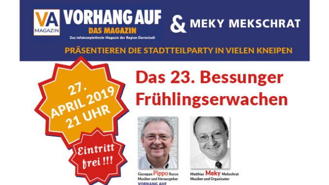 vergangenes Jahr schrieb ich hier darüber, wie das „Bessunger Frühlingserwachen“ entstanden ist. Meky Mekschrat, Sandra Russo und ich haben es erfunden und Sandra gab ihm den Namen. Alles fand im Winter 1996-1997 an einem draußen trüben Abend in der drinnen anheimelnd warmen Kneipe „Orangeriegarten“ in der Herrngartenstraße in Bessungen statt. Die Kneipe gibt es nicht mehr. Andere haben auch geschlossen. Trotzdem gibt es jetzt endlich wieder mehr Spielorte und damit mehr Bands. Erst vor zwei Jahren kam das Vinoso dazu.