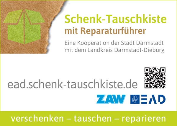 Nicht wegwerfen, sondern stattdessen verschenken, tauschen oder reparieren – das ist das Motto der Schenk-Tauschkiste, einer gemeinsamen Initiative des EAD Darmstadt (Eigenbetrieb für kommunale Aufgaben und Dienstleistungen) Darmstadt und des ZAW (Zweckverband Abfall- und Wertstoffeinsammlung) für den Landkreis Darmstadt-Dieburg. Auf der Internetplattform kann man kostenlos noch brauchbare Dinge verschenken, gegen andere Sachen tauschen oder einfach spenden.